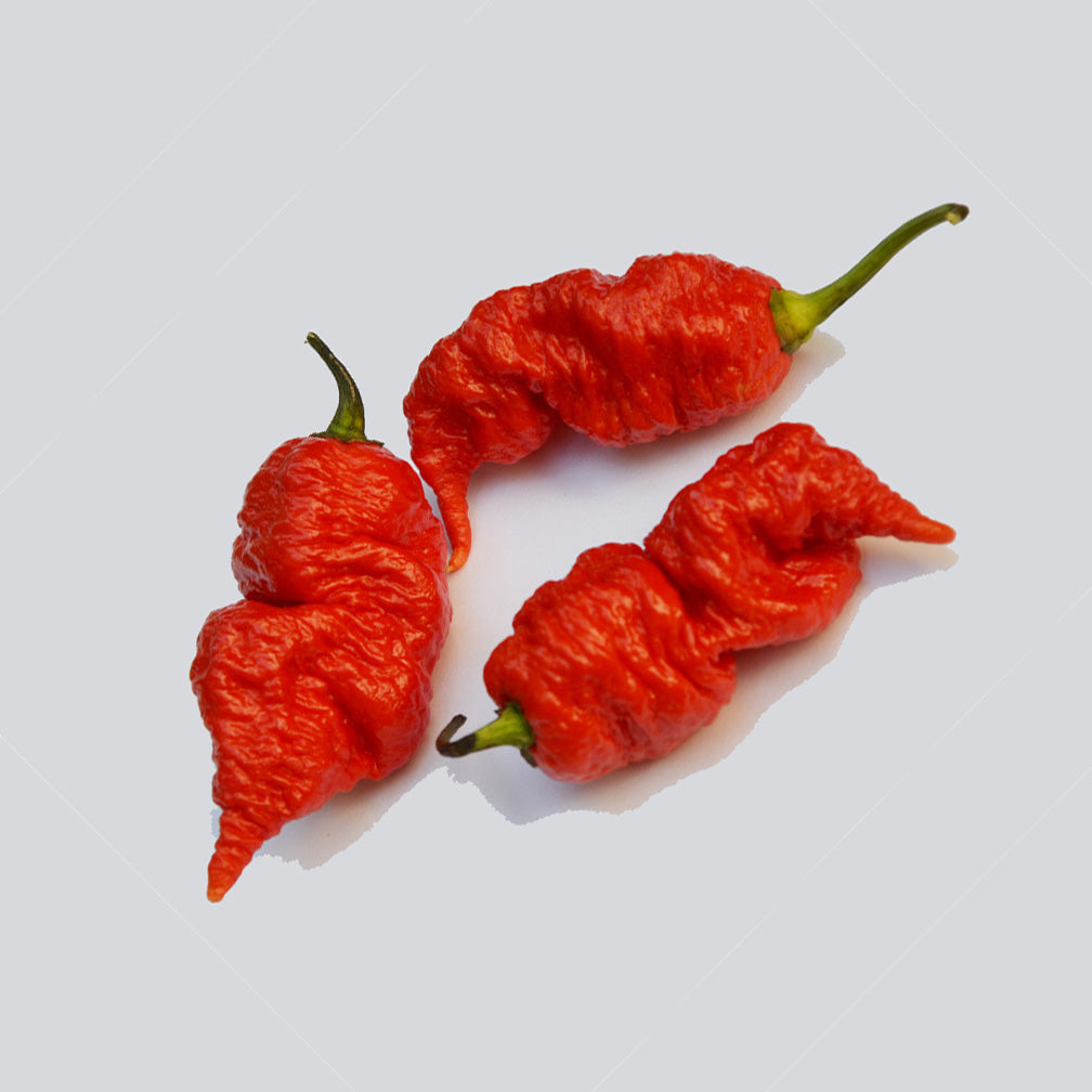 This fiercely contorted pepper delivers an extreme heat experience with a distinctive scythe-like tail and deeply wrinkled surface. Sourced from Refining Fire Chiles' collection of world-class hot varieties, the Death Spiral combines intense Scoville ratings with surprising complexity—a floral undertone precedes the powerful burn that engages the tongue, gums, and palate. Ideal for heat-seeking culinary enthusiasts and hot sauce crafters seeking both intensity and flavor depth.