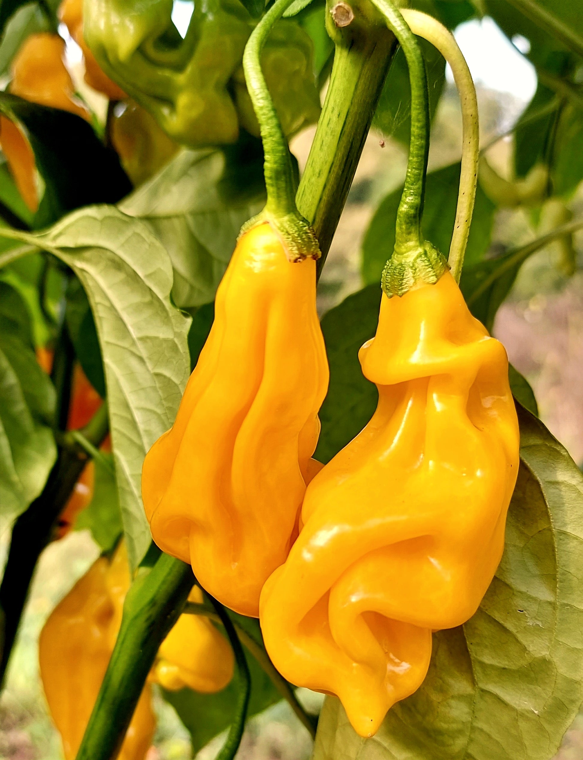 A truly rare habanero type pepper from Malaysia with beautiful contorted pods in a canary yellow color. Chinense or habanero type peppers are not commonly used in East Asia, making this a most intriguing outlier. The heat is approximately equal to a habanero; the pods reach about 3 ½ inches long and are quite ornamental. Try this pepper in a range of dishes or pickle it into a searing hot Malaysian achar!