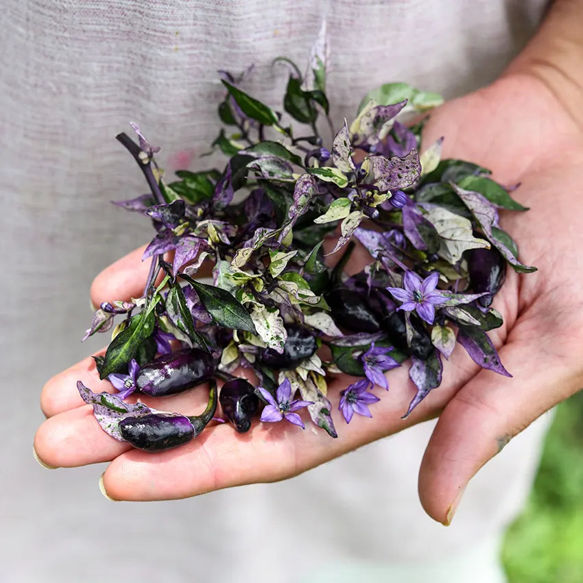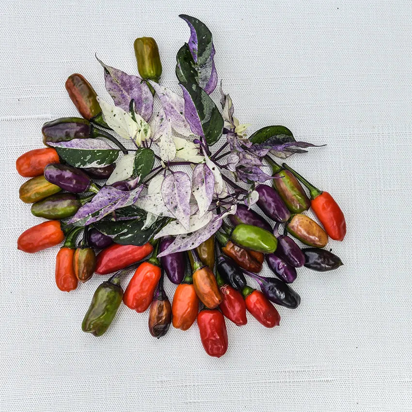 Jigsaw pepper is a stunning feast for the eyes! Leaves are multicolored in tie dye patterns of lavender, cream, violet, sea-foam, and forest green, making it one of the most ornamental peppers. Short, stocky plants produce small, plum-colored fruit, about as spicy as a jalapeño. Try this dazzling edible ornamental in containers or borders, anywhere its ornate foliage can be admired.